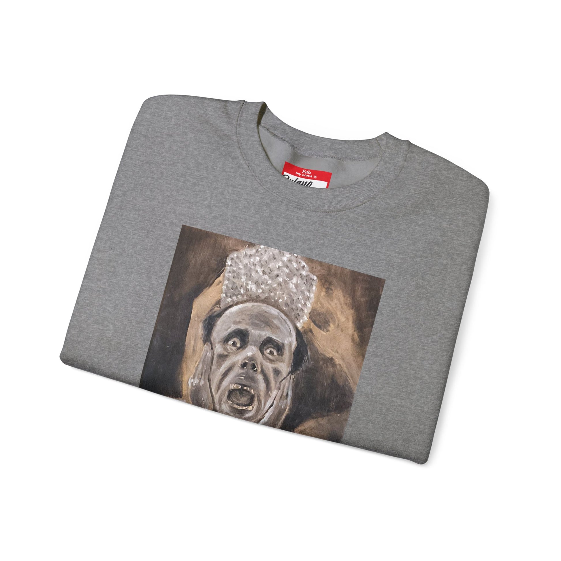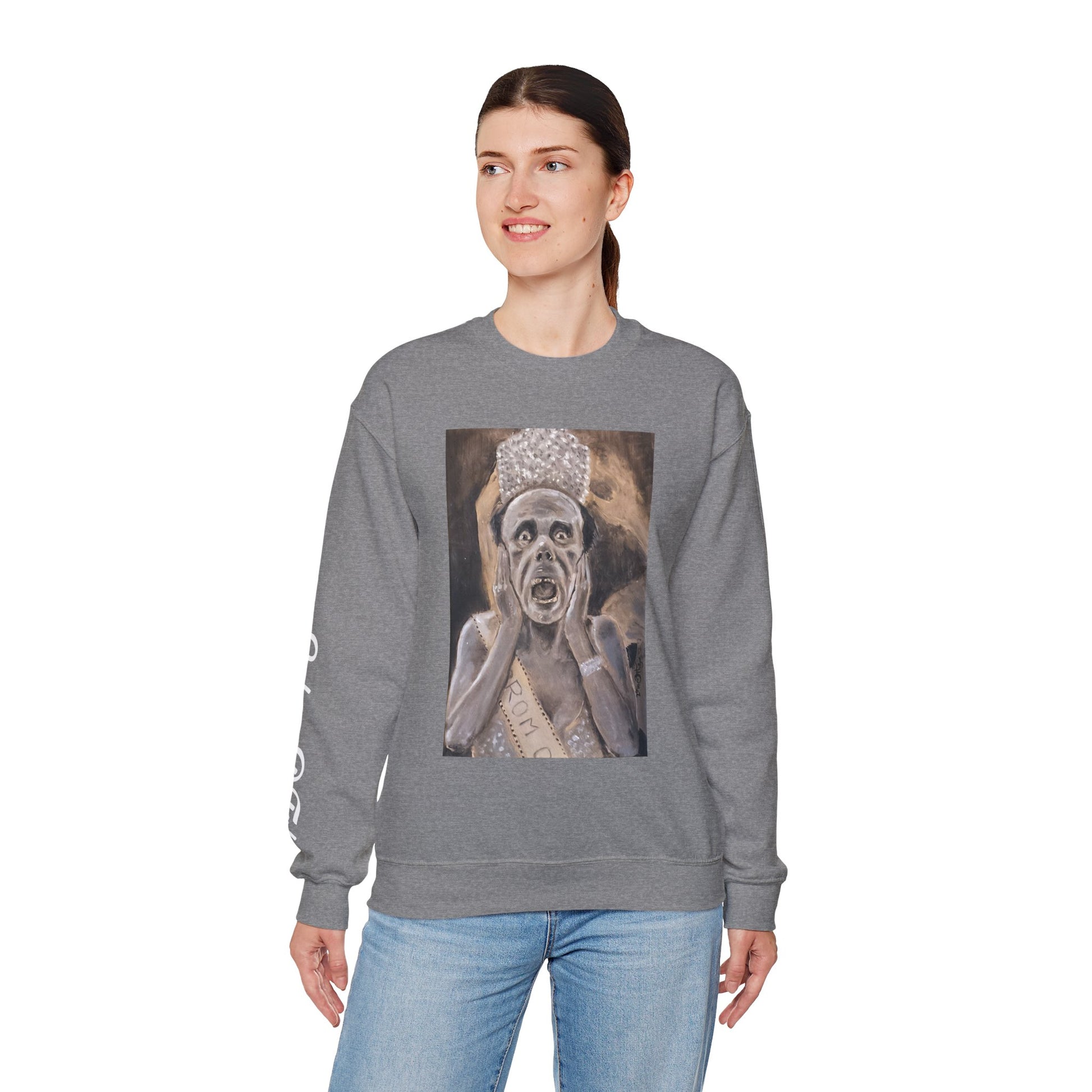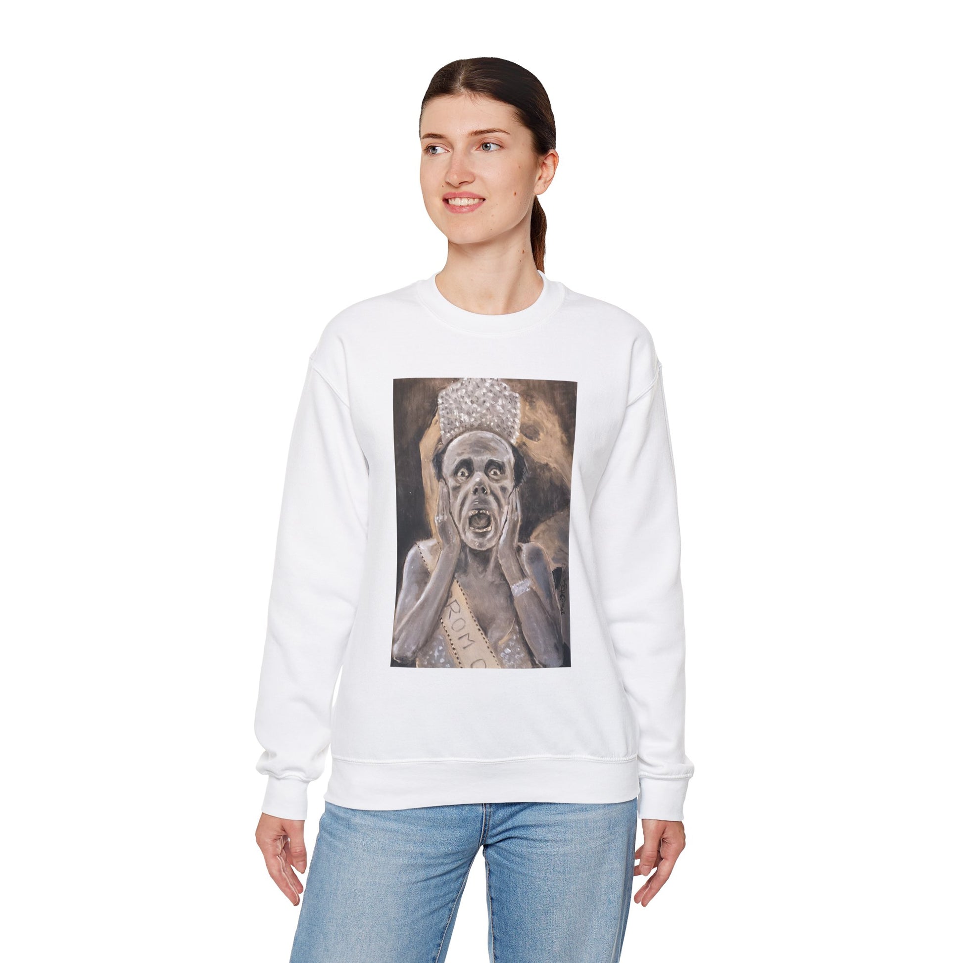 Prom Queen Phantom Unisex Sweatshirt. Bold graphic is printed with Fulano D. Tal branding on the sleeve. It seamlessly blends comfort with style, making it a perfect addition to any wardrobe. The unique design featuring a striking graphic adds a bold statement to your look. Whether you're lounging at home or out with friends, this sweatshirt creates a relaxed and inviting vibe. Ideal for adults who appreciate artistic flair and quality apparel, it’s suitable for casual outings, cozy evenings, or as a gift for art enthusiasts. Keep warm knowing you support local artist's work in style.