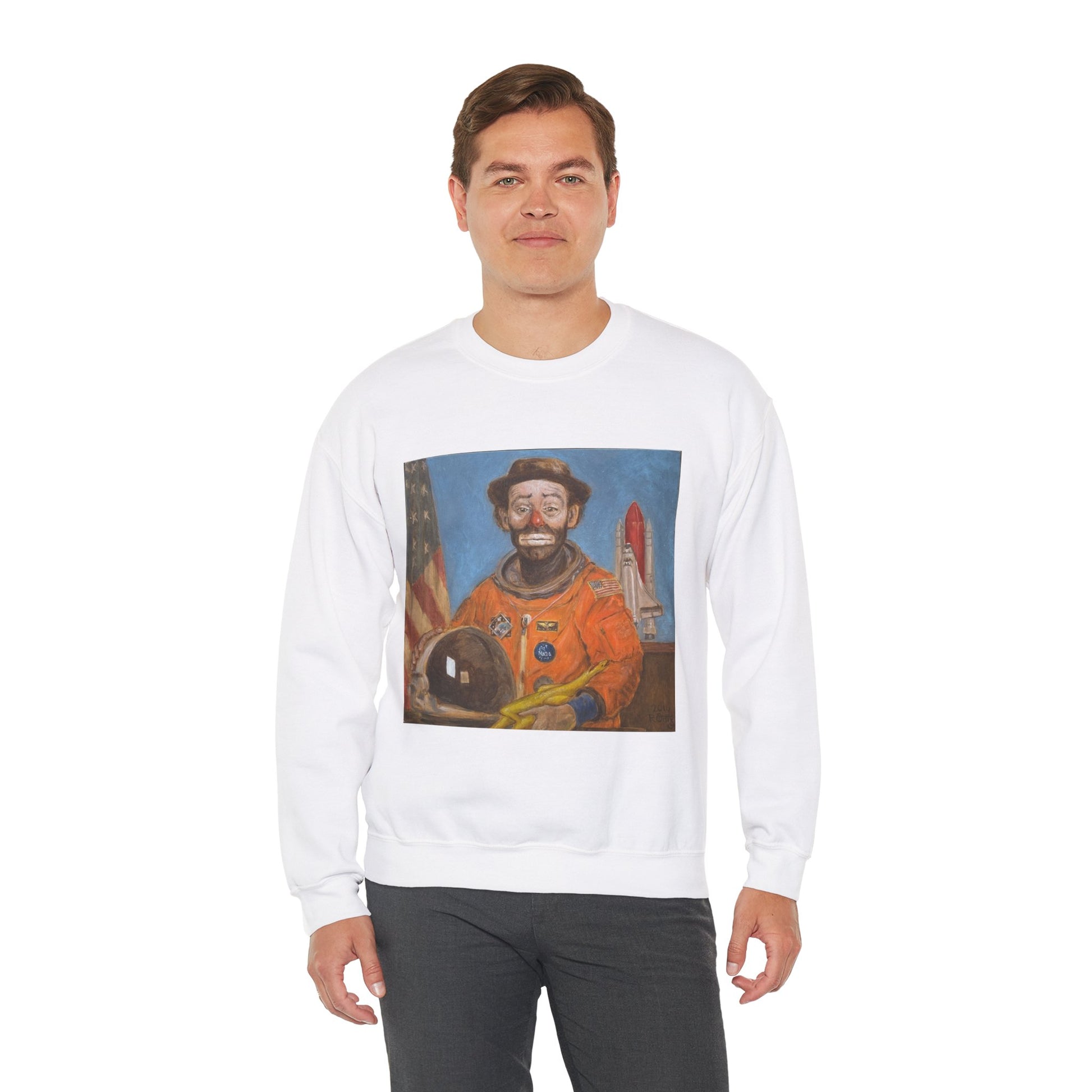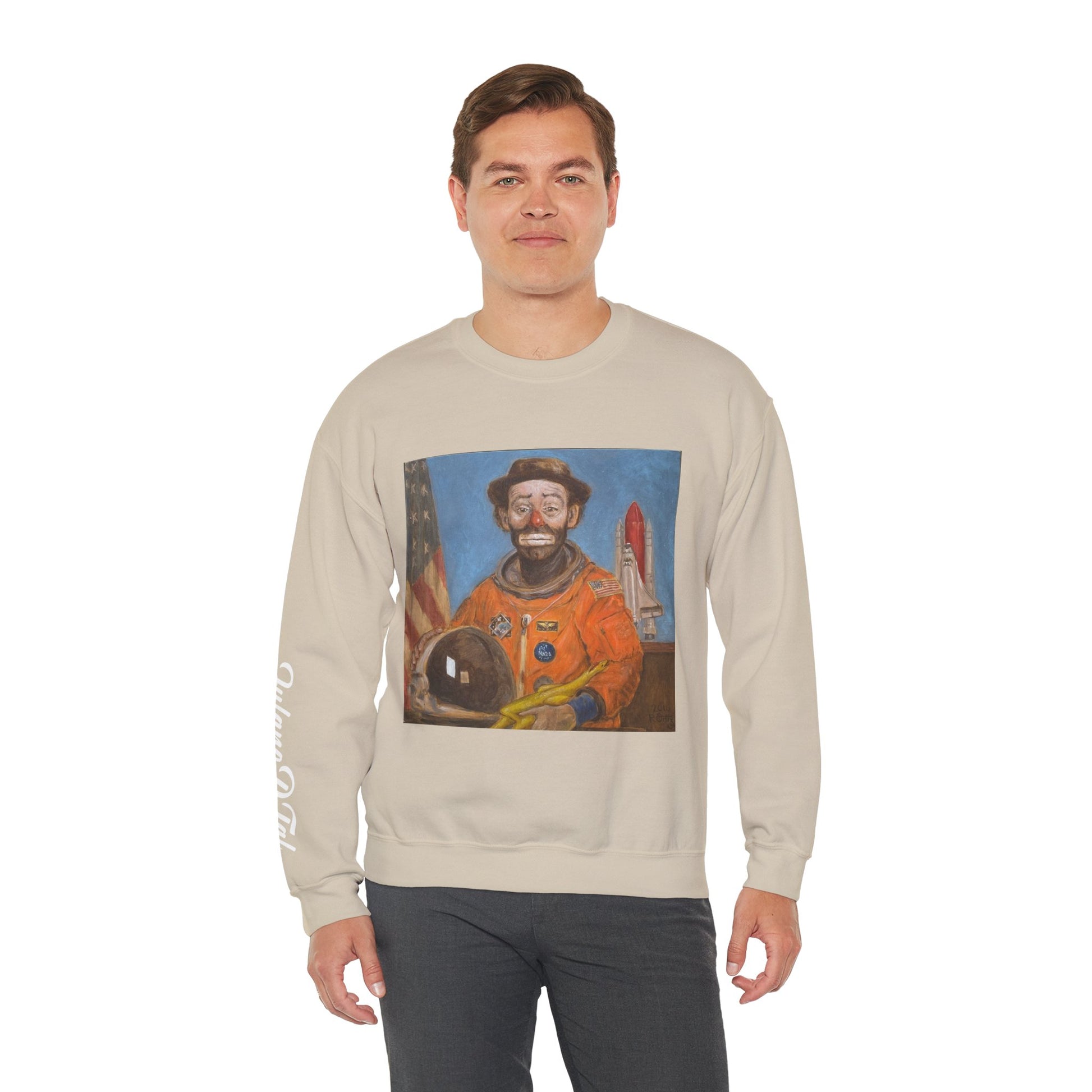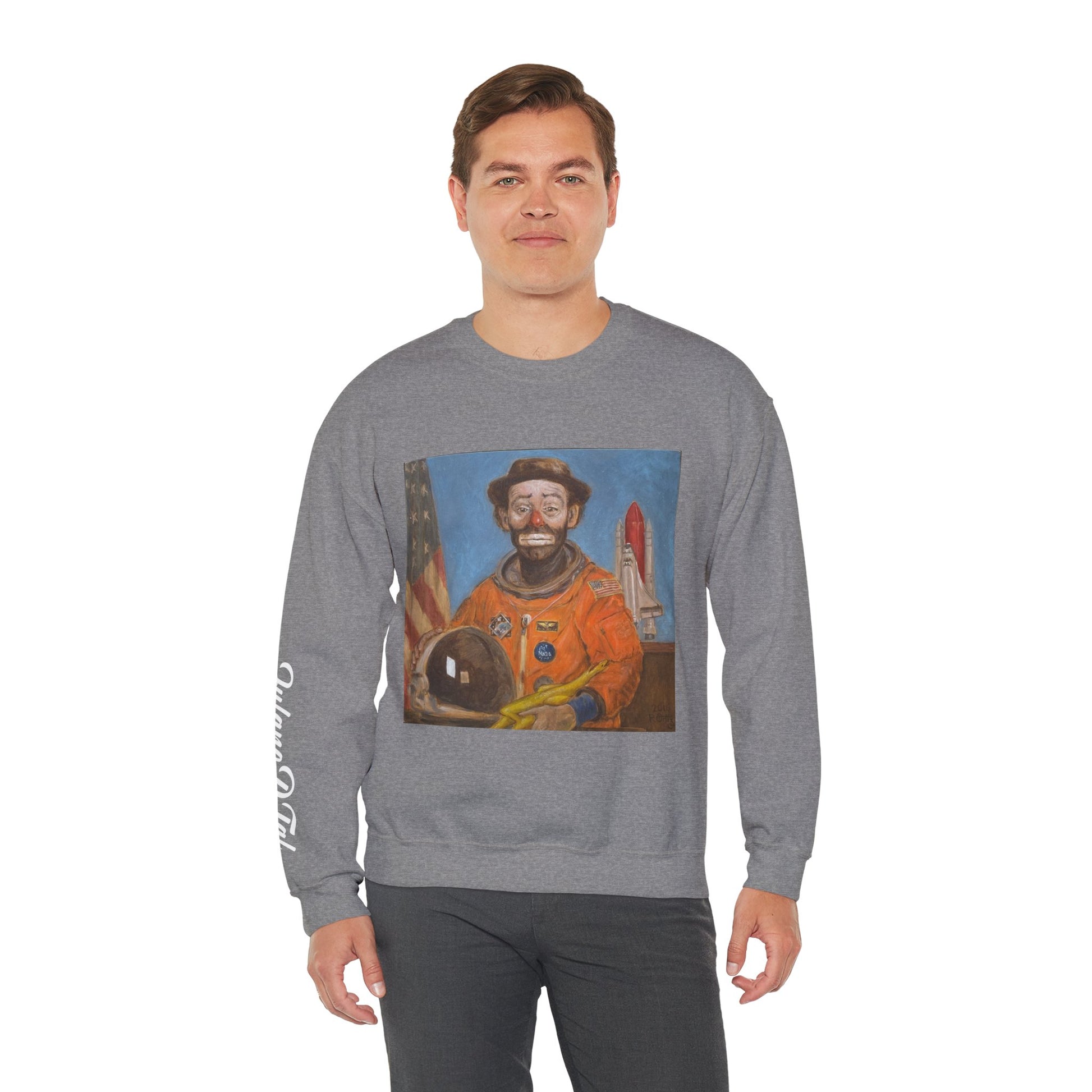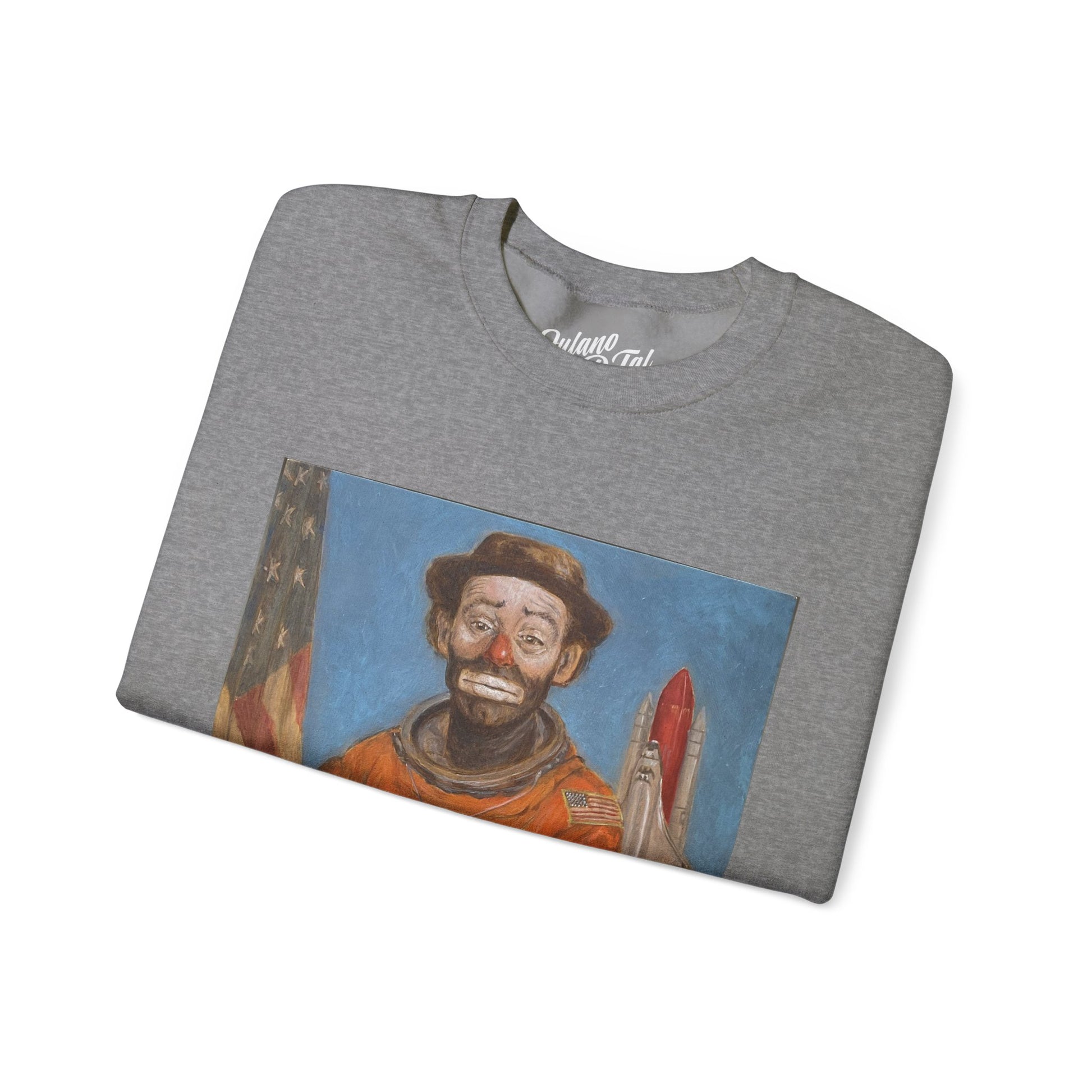 Clown Astronaut Unisex Crewneck Sweatshirt. Bold graphic is printed with Fulano D. Tal branding on the sleeve. It seamlessly blends comfort with style, making it a perfect addition to any wardrobe. The unique design featuring a striking graphic adds a bold statement to your look. Whether you're lounging at home or out with friends, this sweatshirt creates a relaxed and inviting vibe. Ideal for adults who appreciate artistic flair and quality apparel, it’s suitable for casual outings, cozy evenings, or as a gift for art enthusiasts. Keep warm knowing you support local artist's work in style.